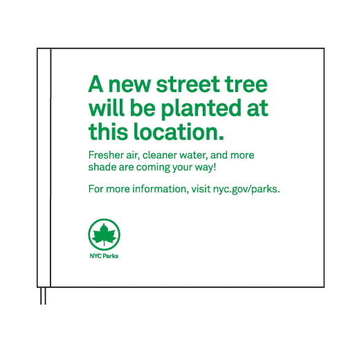 Screen# X2302 White Flag - Green Print - 5x6 - A new street tree will be planted at this location. Fresher air, cleaner water, and more shade are coming your way!  (NYC Parks Logo)