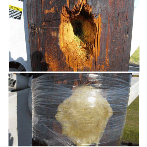 Because UPR™ Pole Repair expands in the hole,it fi lls irregularly shaped cavities for solid integration with the wood. This creates superior adhesion to the wood grain compared to other non-expanding products. UPR™ Pole Repair hardens just like wood so it is gaffable and won’t chip out in chunks when climber’s hooks are embedded into its surface structure.
